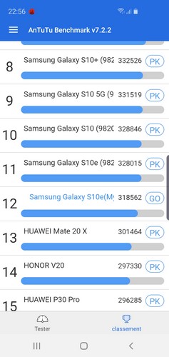 Pour les amateurs de benchmarks, nous avons passé le Galaxy S10e dans AnTuTu et Disk Speed. AnTuTu le place parmi les meilleurs, tandis que Disk Speed indique des pointes à 204 Mo/s en écriture pour la mémoire interne et 771 Mo/s en lecture.