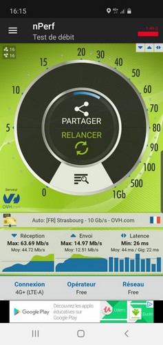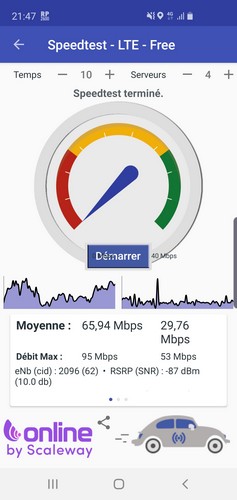 En intérieur, nous étions généralement autour des 50-60 Mbit/s en réception. Ci-dessous, un test en zone résidentielle plutôt dense et depuis la salle de rédaction d’Univers Freebox
