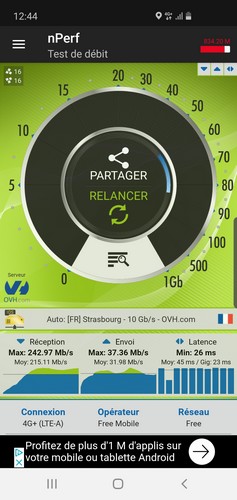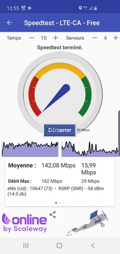 Durant nos tests en extérieur, nous étions à plusieurs reprises à plus de 100 Mbit/s. Nous avons même pu approcher les 250 Mbit/s.