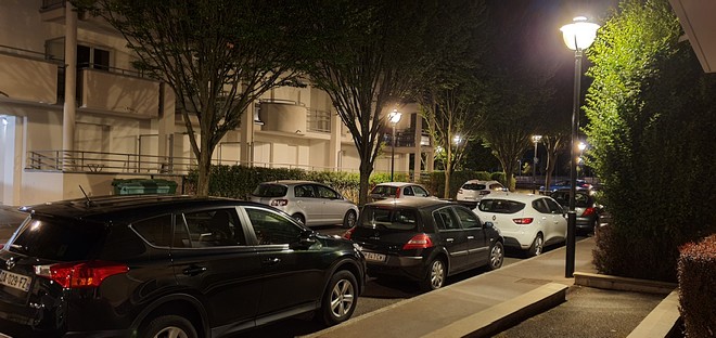 Une photo de nuit dans sa version normale, puis avec le mode nuit qui redonne du vert aux feuilles, éclaircit certaines zones sombres et corrige les halos de lumière :