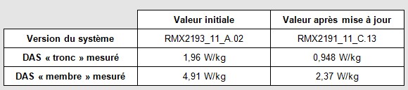 Comme l’a contrôlé l’ANFR, une mise à jour logicielle déployée par le constructeur a permis de ramener cette valeur à 2,37 W/kg. En parallèle, le DAS tronc est passé de 1,96 à 0,948 W/kg. “La mise à jour est automatiquement diffusée aux téléphones correspondants, dès lors qu’ils sont connectés à un réseau de données (réseau mobile ou Wi-Fi)”, indique l’autorité administrative. Elle invite ainsi les propriétaires à vérifier l’installation de cette mise à jour.