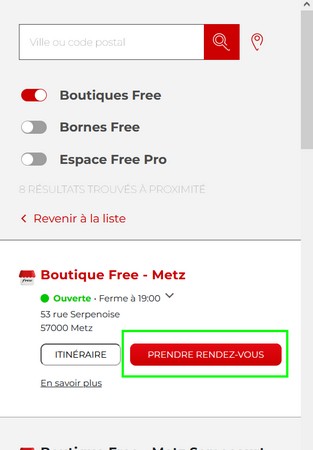 Une fois sur la page permettant de localiser les Free Centers près de chez vous, cliquez simplement sur le bouton “Prendre rendez-vous”