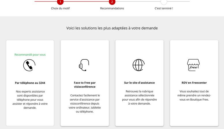 Vous avez une question sur les offres ou rencontrez un problème technique et êtes totalement perdus ? En quelques clics, Free peut vous guider lors du choix du canal d’assistance optimal.