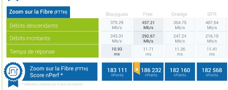 Une nouvelle fois Free est l’opérateur qui offre le meilleur débit en #FTTH avec moyenne de 457,21 Mb/s en débit⬇️ et 292,67 Mb/s en débit⬆️selon baromètre @nPerf des connexions fixes en France ! https://t.co/xpcqdCsQBQ #fibre #THD pic.twitter.com/9Z41fhIlk1— Free (@free) 1 août 2019