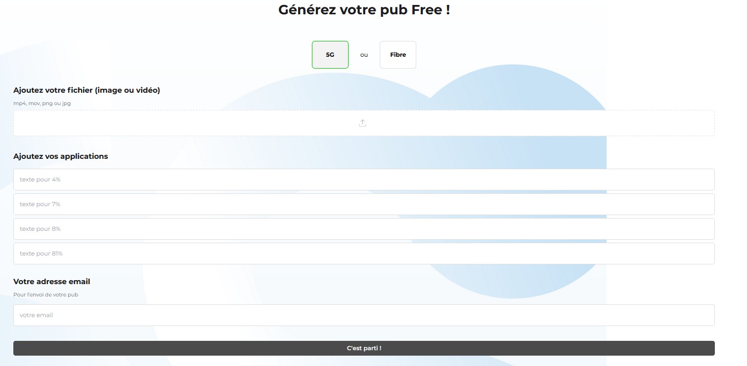Depuis une page https://pub.free.fr/ créée pour l’occasion, ils auront accès à un formulaire les invitant à envoyer une photo ou vidéo, mais également à renseigner leurs usages face à différentes proportions. Cette publicité est en fait une version personnalisée d’une campagne TV lancée durant l’été dernier et déclinée par la suite sur le mobilier urbain.