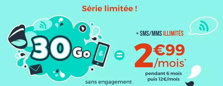 Le forfait inclut les appels, SMS et MMS en illimité, ainsi qu’une enveloppe de 30 Go à utiliser en France avec des débits 3G/4G (selon la couverture disponible). Pour les autres pays de l’Union européenne, il propose une enveloppe supplémentaire de 3 Go et des débits 3G/3G+.