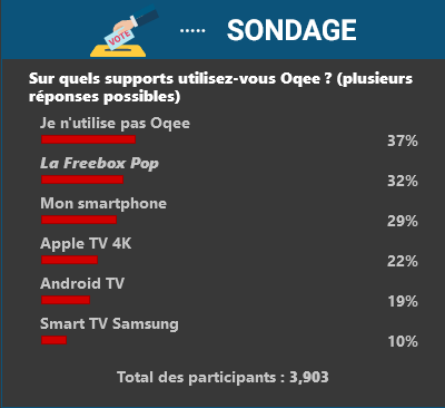 Cependant, du côté des utilisateurs de l’interface, le résultat est bien plus homogène. Si l’on aurait pu s’attendre à une domination écrasante de la Freebox Pop, celle-ci représente 32% des réponses apportées au sondage. Si elle reste bien sûr l’appareil le plus utilisé pour Oqee, la dernière Freebox est cependant suivie de très près par l’utilisation sur smartphone. Lancée en juillet dernier, l’application Oqee by Free disponible pour les abonnés Freebox Delta et Pop sur Android et iOS a séduit 29% des sondés.