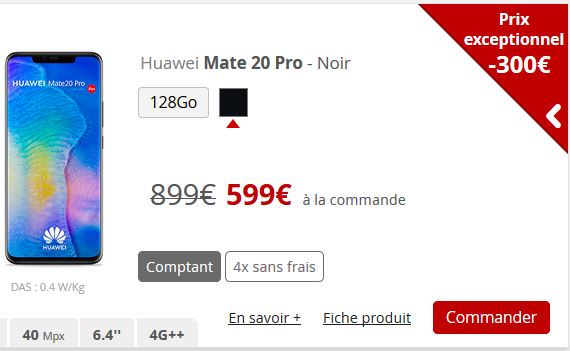 Pour sa version standard, le Mate 20 passe de 699€ à 399€ au comptant. Pour le paiement en 4 fois, il vous faudra payer 102€ à la commande puis 99€ pendant trois mois.