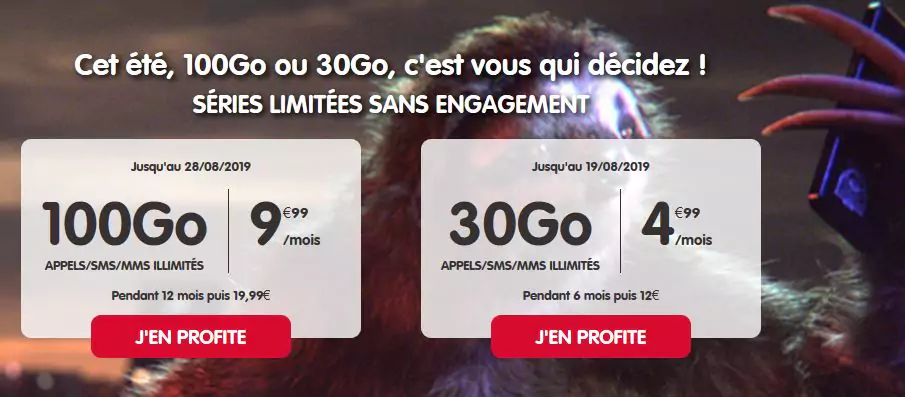 En complément de son offre limitée jusqu’au 28 août pour un forfait à 100Go, le MVNO propose une promo sur son forfait mobile 30Go.Jusqu’au 19 août prochain, NRJ Mobile propose un forfait pour 4,99 euros/mois, comprenant les appels, SMS et MMS en illimité, ainsi qu’une enveloppe data de 30 Go en 3G/4G. À noter que le tarif promotionnel est valable durant les 6 premiers mois. L’offre prend la forme d’une remise de 4.99€ par mois pendant les six premiers mois, au-delà, le prix repasse à 12 euros par mois.