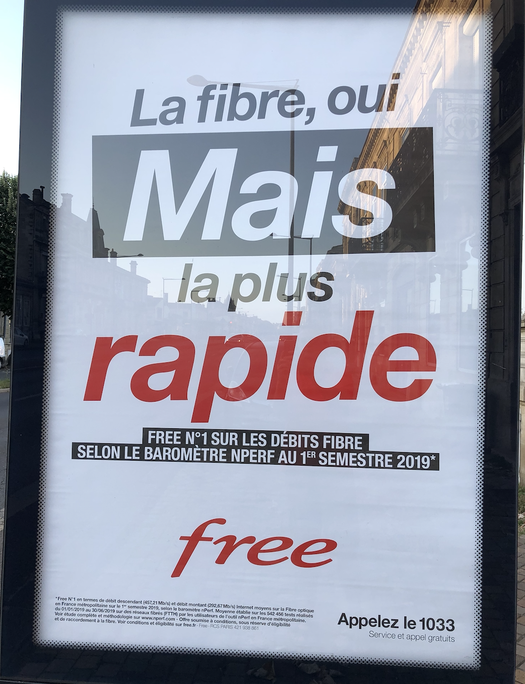 Si son message publicitaire tape à l’oeil "Démo-cratisons la fibre" pullule depuis plusieurs jours partout en France notamment dans les abribus, Free a décidé d’en rajouter une couche avec deux nouvelles affiches mettant en exergue sa fibre et ses débits. Exit les images et place une nouvelle fois à un texte simple et efficace. "La fibre, oui mais la plus rapide", peut-on lire sur l’une d’entre-elle, Free se targuant d’être numéro 1 sur les débits fibre selon le baromètre nPerf du 1er semestre 2019.