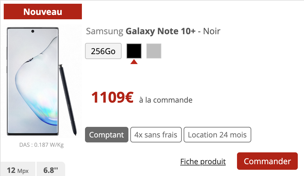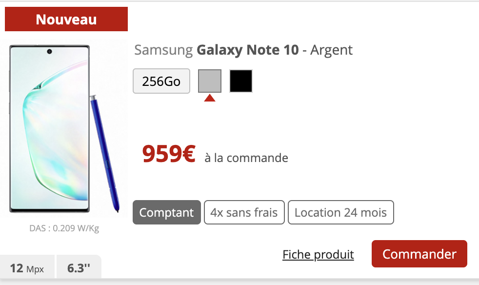 Proposé en deux coloris, Argent et Noir, le Galaxy note 10 dans sa version 256 Go est proposé à 959€ en achat comptant, mais il est également possible d’opter pour un paiement en 4 fois sans frais soit 242€ à la commande puis trois fois 239€. Pour ceux qui le souhaitent, il est également possible de le louer pendant 24 mois pour 24€ par mois, avec un premier paiement de 179€ à la commande.