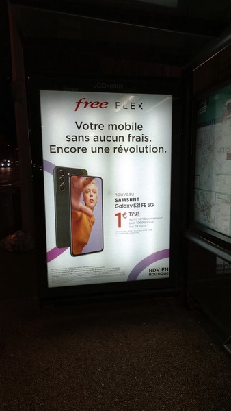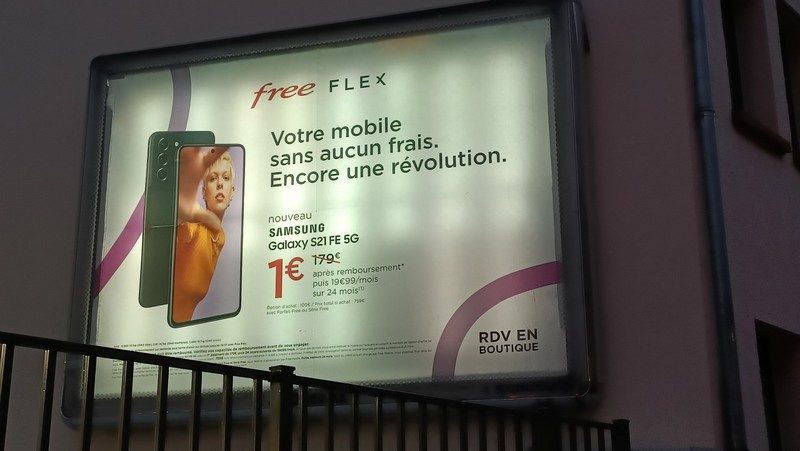 “Encore une révolution”, indique Free dans une campagne publicitaire déployée sur le mobilier urbain. L’opérateur de Xavier Niel habille les abribus et les panneaux 4 x 3 pour rappeler que son offre de location avec option d’achat Free Flex permet d’acquérir son smartphone sans aucun frais. Parmi eux, des modèles d’entrée de gamme comme des modèles haut de gamme, et même le Galaxy S21 FE 5G tout juste annoncé par Samsung.