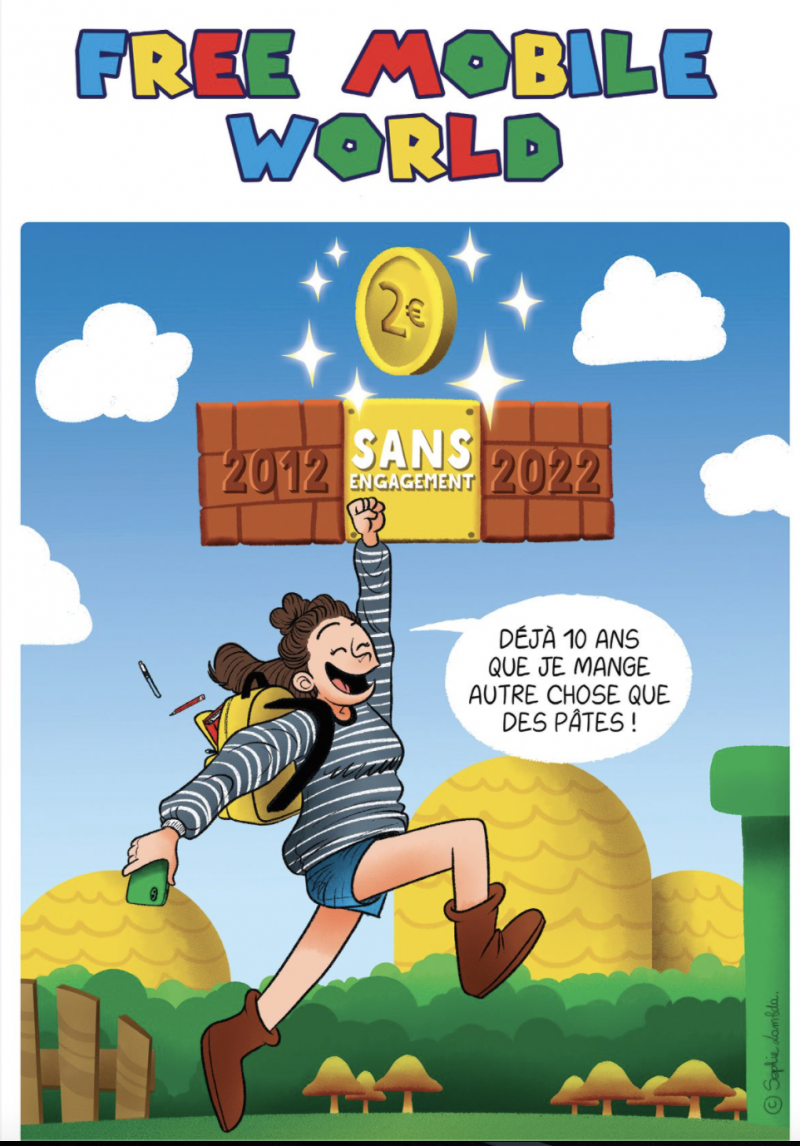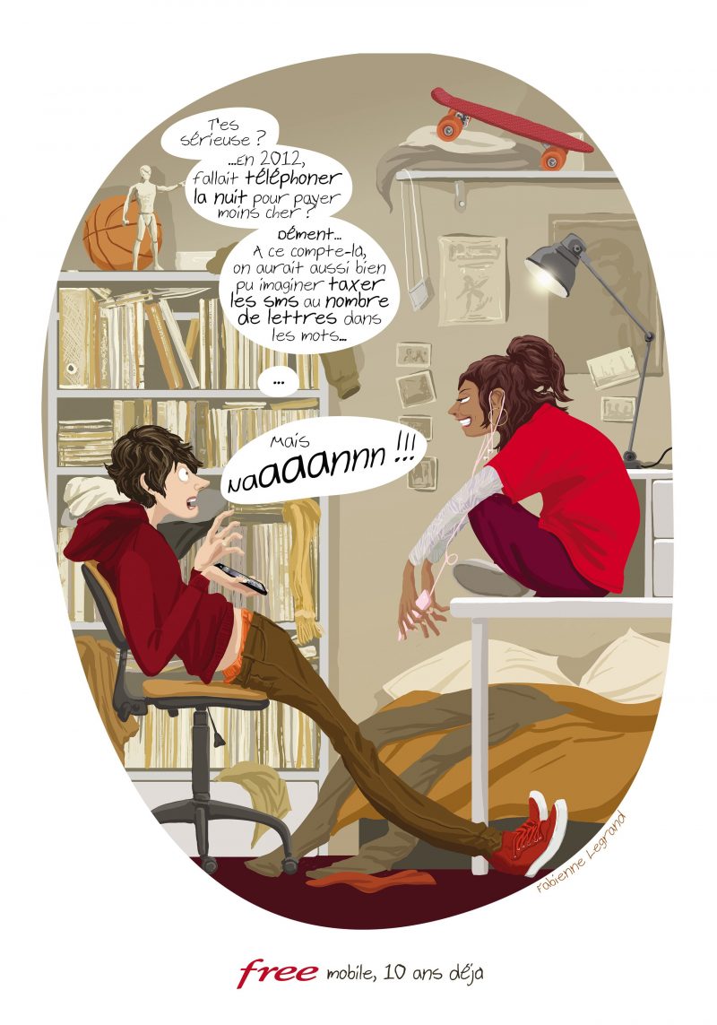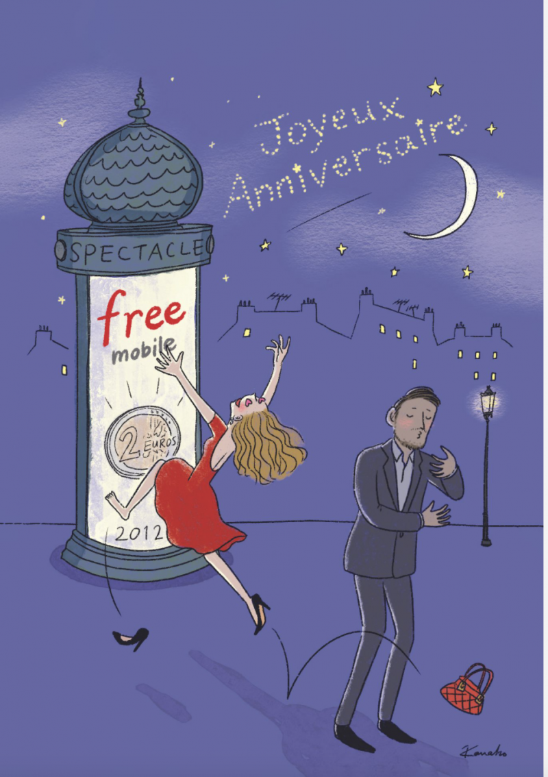 Dix coups de crayon pour ses 10 ans. Afin de célébrer l’anniversaire de Free Mobile, l’opérateur a demandé à 10 illustrateurs et illustratrices de livrer leur regard sur sa révolution initiée le 10 janvier 2012 sur le marché du mobile. A l’honneur, le sans engagement, la liberté, le forfait 2€, ou encore des prix inchangés. Découvrez le style et le travail inspiré de Vaïnui de Castelbajac, Flock, Kanako, Sophie Lambda, Fabienne Legrand, Mykaïa, Peter Patfawl, Mathieu Persan, Daria Piromalli, et Ysope.