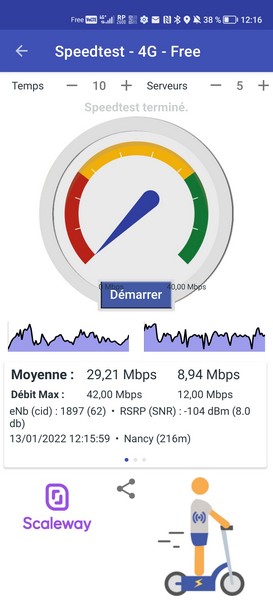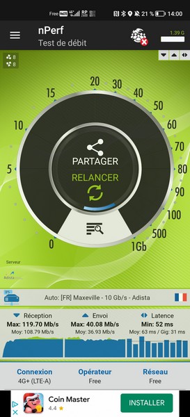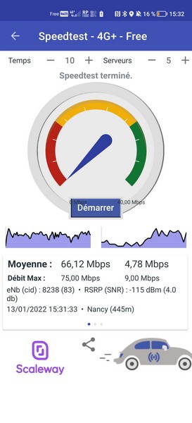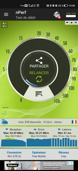 Le Honor 50 Lite s’équipe du SoC Snapdragon 662, une plate-forme limitée à la 4G pour la partie réseau mobile. Pas de 5G pour lui, donc. Il propose en revanche une gestion dual-SIM, permettant ainsi de gérer deux numéros mobiles depuis un même terminal. Comme à chaque test, nous avons réalisé des mesures de débits avec les outils nPerf et RNC Mobile, disponibles sur le Play Store de Google.