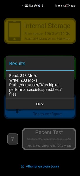 Si la mémoire interne de stockage ne fait pas office de goulet d’étranglement, les vitesses en écriture et en lecture mesurées avec l’outil Disk Speed ne sont pas d’exceptionnelles non plus.