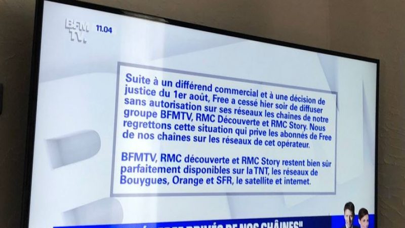 L’encart indique ainsi que "suite à un différend commercial et à une décision de justice du 1er août, Free a cessé hier soir de diffuser sans autorisation sur ses réseaux les chaînes de notre groupe BFMTV, RMC Découverte et RMC Story". Il est également indiqué que les chaînes sont toujours disponibles via la TNT , les autres box ainsi que le satellite et Internet. Le message fait également office de communiqué de presse de la part du groupe.