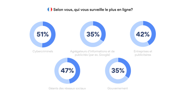 En effet, 51% des interrogés pensent être surveillés par des cybercriminels, mais pas seulement. Parmi les surveillants supposés, on compte également 47% de Français considérant que les géants des réseaux sociaux les surveillent énormément et 42% s’inquiètent du fait que des marques ou des agences de publicités s’intéressent à leurs données. Viennent ensuite le gouvernement (35%) et les agrégateurs d’informations et de publicité comme Google (35%).