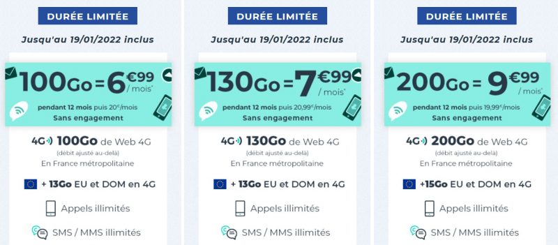 Jusqu’au 19 janvier 2022, la marque Cdiscount Mobile commercialise des forfaits 4G 100, 130 et 200 Go (débit ajusté au-delà) à 6,99, 7,99 et 9,99 euros par mois. Ces séries limitées sans engagement comprennent par ailleurs les appels, SMS et MMS en illimité, ainsi qu’une enveloppe data mobile de 13 ou 15 Go utilisable en 3G/4G pour le roaming depuis l’Europe et les DOM.