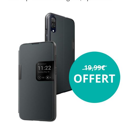 Il s’agit ici d’une coque de protection intégrale Wiko Smart Flolio, d’une valeur de 19.99€ avec une fenêtre de visualisation intelligente : qui permet donc d’avoir son compteur de notifications, de voir les appels entrants et la musique en cours de lecture sur votre coque.