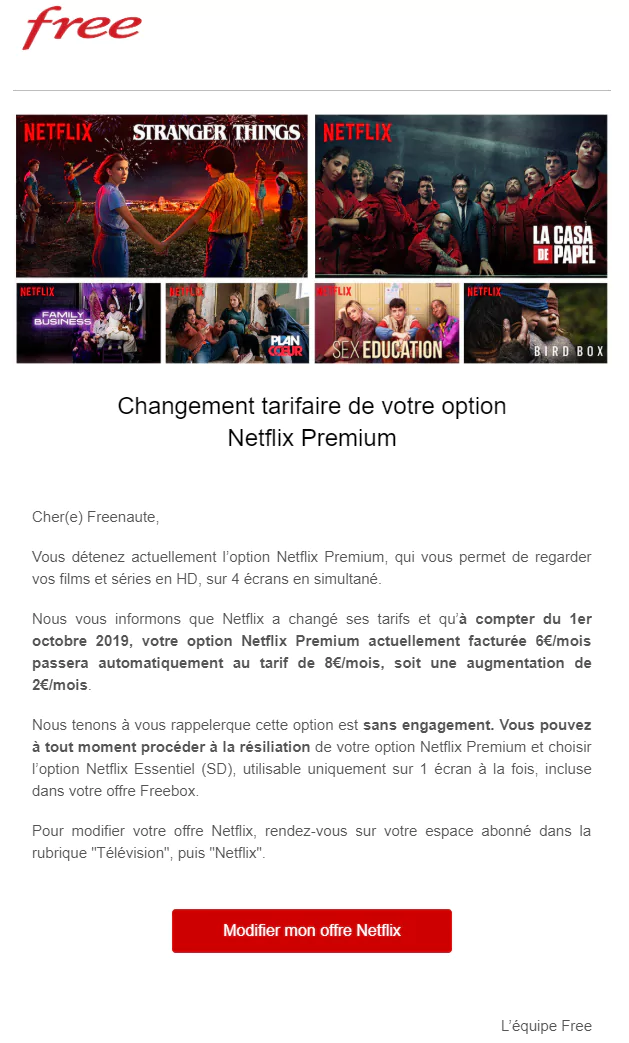 C’est à travers un mail envoyé par Free à ses abonnés Freebox Delta que l’opérateur prévient du changement de tarif des options Netflix Standard et Premium pour le 1er octobre prochain. En effet, si l’abonnement Netflix essentiel est inclus dans les offres Freebox One et Delta, il est possible, moyennant un supplément sur la facture, de passer aux offres standard (deux écrans et HD) et Premium (4 écrans et 4K) de Netflix.