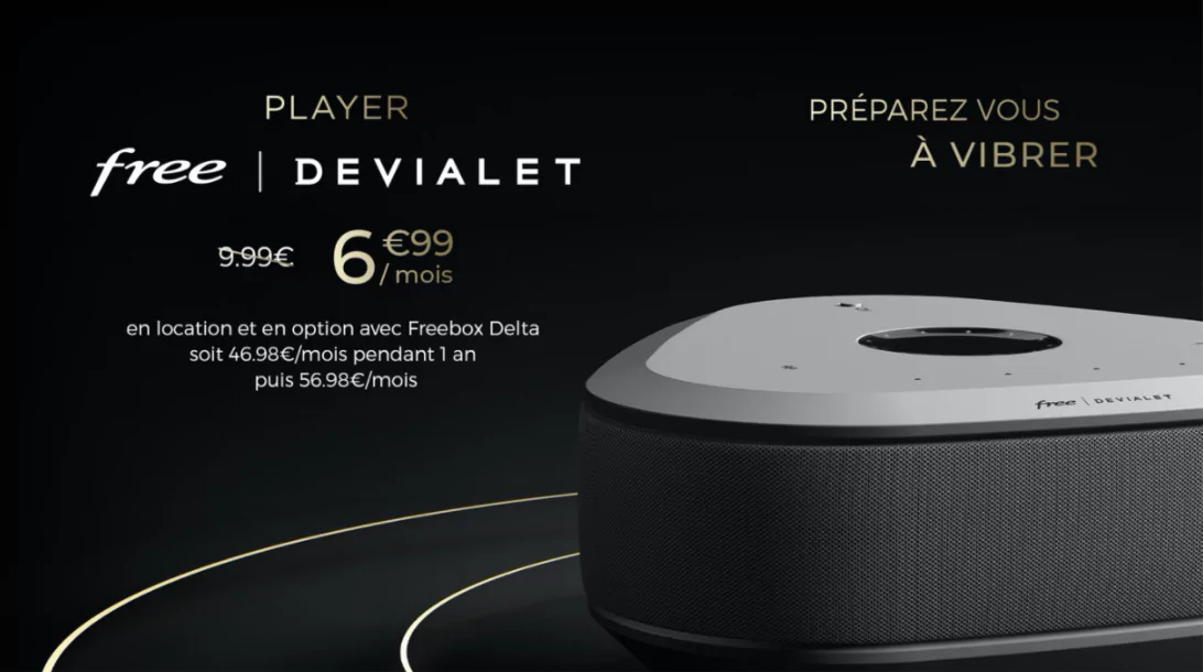 “Free fait évoluer son offre Freebox Delta pour les nouveaux abonnés : désormais il est possible d’accéder au Player Free Devialet en location à 6,99€/mois (au lieu de 9,99€/mois) avec l’offre Freebox Delta pour 46,98€/mois pendant un an (puis 56,98€/mois)”, nous apprend Free ce 18 janvier. Cette location prend donc la forme d’une option, sans engagement, pour ceux désirant bénéficier des qualités sonores de l’enceinte connectée ainsi que de l’interface maison du Player. Le tarif promotionnel de 6.99€/mois n’est cependant valable que pour toute nouvelle souscription jusqu’au 28 février prochain. L’option est résiliable à tout moment depuis l’espace abonné Freebox.