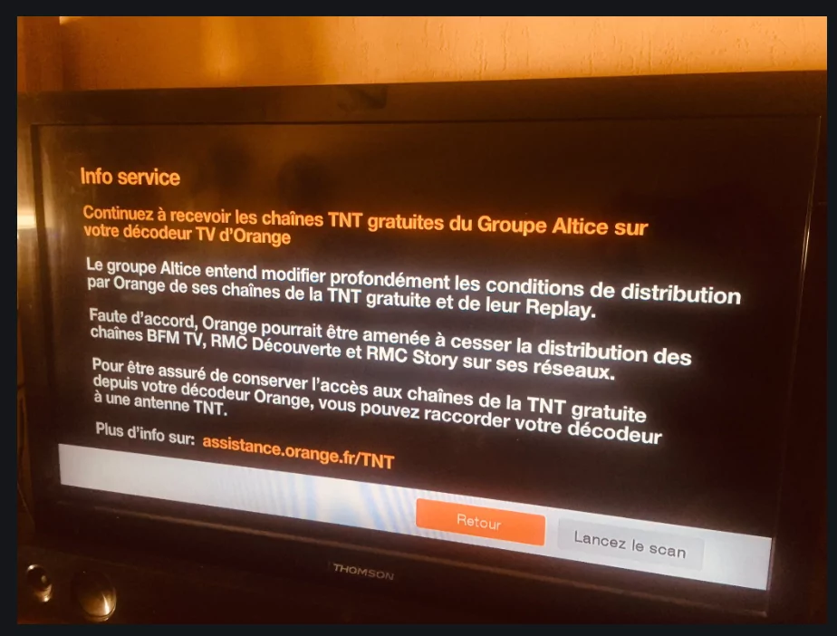 "Le groupe Altice entend modifier profondément les conditions de distribution par Orange de ses chaînes de la TNT gratuite et de leur Replay. Faute d’accord, Orange pourrait être amené à cesser la distribution des chaînes BFM TV, RMC Découverte et RMC Story sur ses réseaux », tel est le message d’information diffusé ce matin par l’opérateur historique sur ses Livebox. En pleines négociations avec le groupe de Patrick Drahi, Orange confirme une nouvelle fois s’aligner sur la position de Free, lequel a dores et déjà arrêté la diffusion des chaînes gratuites d’Altice sur ses Freebox le 27 août peu avant minuit. Tout comme l’opérateur de Xavier Niel, Orange " considère qu’il y a un équilibre entre les éditeurs de chaînes et les opérateurs que nous sommes : en transportant gratuitement les chaînes nous leur assurions une audience, sans demander de rémunération en retour", a déclaré Stéphane Richard, PDG du groupe la semaine dernière. Et d’ajouter en revanche ne pas souhaiter "en arriver au même point que Free" tout en envisageant de couper également le signal s’il n’y a pas d’accord.