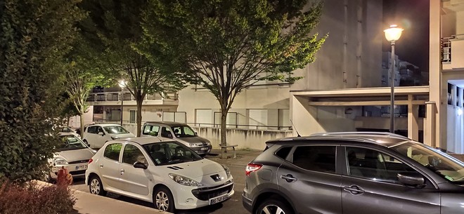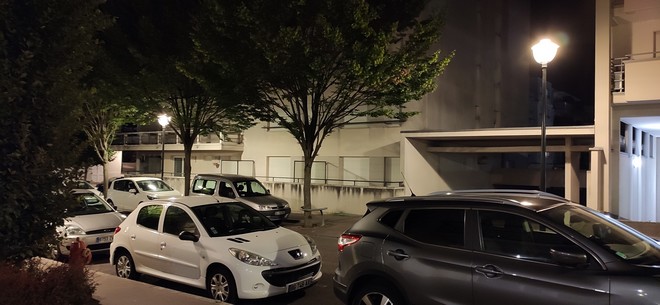 Une photo prise la nuit, en fonctionnement classique, puis avec le mode nuit (qui corrige les halos de lumière, redonne du vert aux arbres, redessine les voitures au premier plan et redonne de la netteté à l’ensemble) :