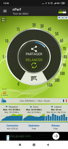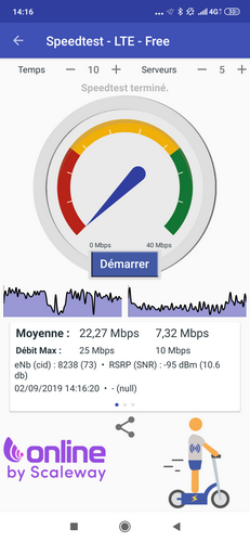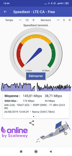 Durant nos tests de débits avec les outils nPerf ou RNC Mobile, nous avons franchi à plusieurs reprises les 100 Mbit/s en réception, en extérieur.