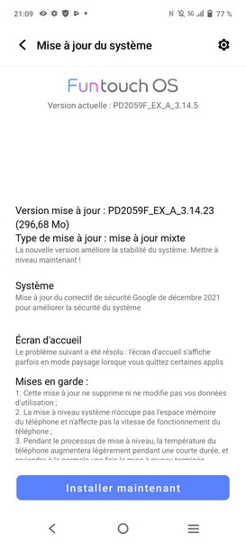 Concernant la partie sécurité, enfin, une mise à jour d’environ 300 Mo nous a permis d’installer les patchs de sécurité du mois de décembre 2021. Pas les derniers, mais presque. Les deux solutions de déverrouillage, à savoir le lecteur d’empreintes digitales sous la dalle et la reconnaissance faciale avec la caméra avant, ont été efficaces du début à la fin. Rien à redire de ce côte-là.