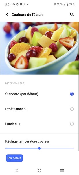 L’écran du Vivo X60 Pro est indéniablement un atout, tant sur le papier qu’à l’usage. Il offre de belles couleurs, se montre fluide et propose une belle luminosité, y compris en extérieur. Le poinçon pour la caméra frontale n’est pas excentré pour sortir plus facilement du champ de vision, mais sa taille contribue tout de même à sa grande discrétion. Dans les réglages, on pourra ajuster les couleurs et le taux de rafraîchissement (60 Hz, 120 Hz ou intelligent). On trouvera aussi des options telles que le mode sombre programmable, le mode protection des yeux programmable (ton plus chaud) ou la fonction anti-scintillement.