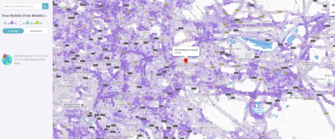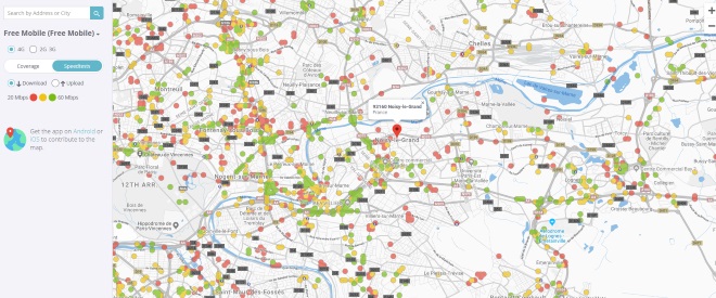 Selon les résultats des tests effectués par les abonnés Free Mobile, les zones rouges ont un débit inférieur à 20Mb/s, pour les zones jaunes le débit est compris entre 20 et 60Mb/s et pour les zones vertes le débit est au dessus de 60Mb/s.