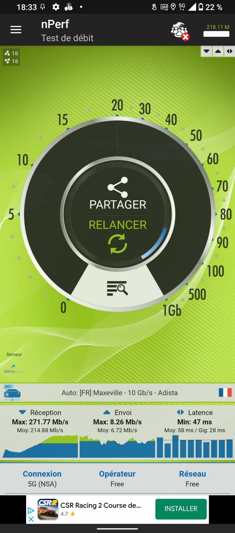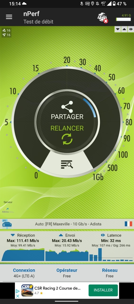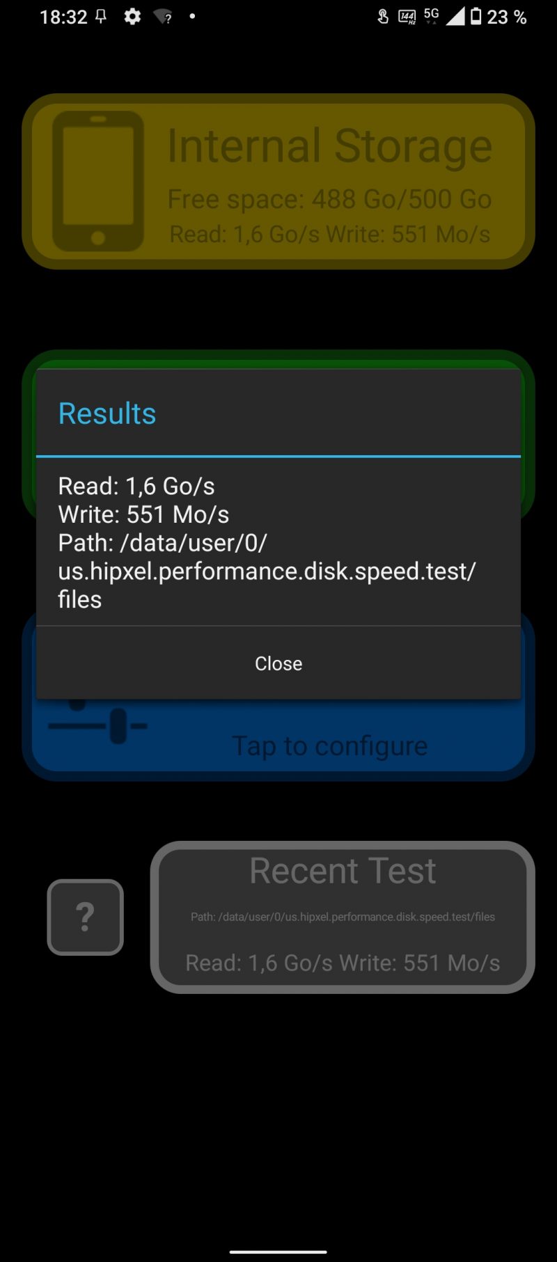 Les performances de la mémoire interne de stockage participent à la fluidité de l’ensemble. Disk Speed, l’outil que nous utilisons habituellement et que vous pouvez retrouver sur le Play Store, indiquait 551 Mo/s en écriture et 1,6 Go en lecture. À noter que le smartphone ne propose pas d’extension par carte MicroSD. Cela dit, avec 512 Go, il y a – a priori – de quoi faire pour un petit moment.