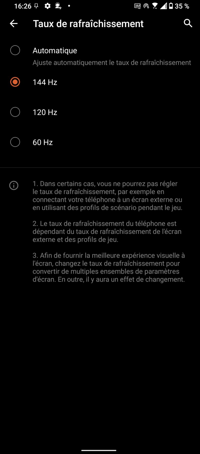 Immense, lumineux, fluide, l’écran de l’Asus Rog Phone 5S Pro se montre vite convaincant à l’usage. Parfait ? Il n’y a qu’un pas. Pas de poinçon ou d’encoche puisque le constructeur a opté pour une fine bordure afin d’intégrer la caméra frontale. Bref, pas d’intrus dans l’écran, notamment en vidéo ou en jeu. Depuis les paramètres, il sera possible d’ajuster le taux de rafraîchissement (60 Hz, 120 Hz, 144 Hz ou automatique), mais également le mode de couleur. Les options comprennent aussi un mode nuit programmable, un éclairage nocturne (plus chaud) et le mode Always-on Panel.
