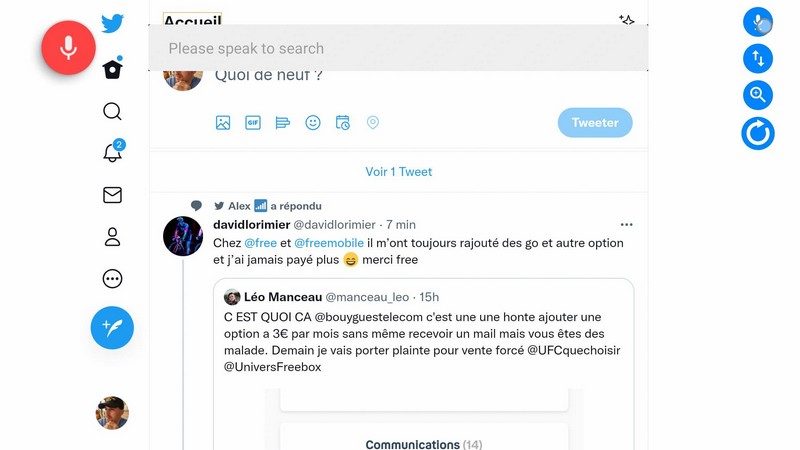 L’interface de TV Tweet a été adaptée. Aussi, quelques boutons bleus en haut à droite permettent de lancer une recherche vocale (le premier), de zoomer sur la page (le troisième) ou d’activer un défilement automatique (le deuxième).
