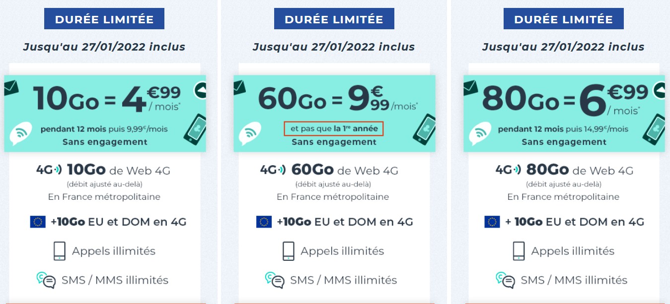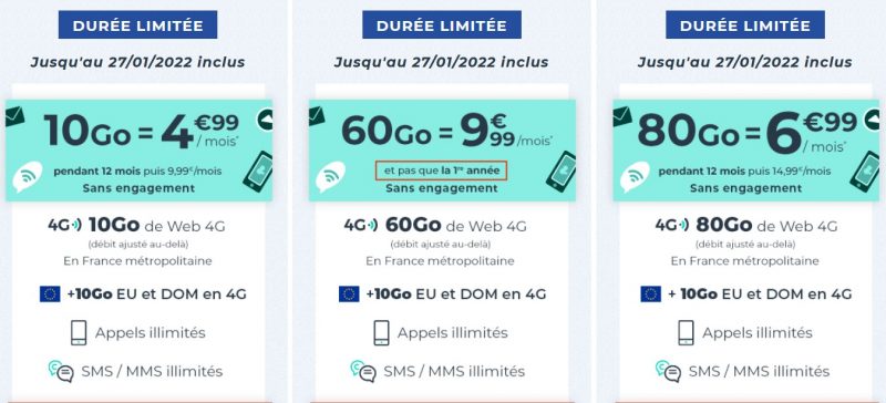 Pour ces trois forfaits mobiles, la carte SIM triple découpe est à payer au moment de la commande et coûte 10 euros.