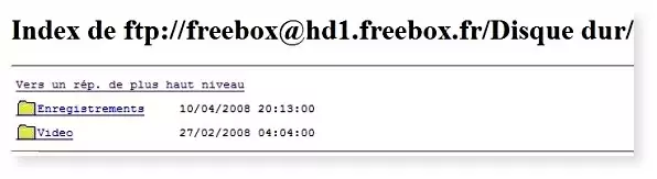 Depuis n’importe quel PC, vous pourrez vous connecter à votre disque dur et ainsi retrouver toutes vos vidéos à l’adresse suivante : ftp://login :motdepasse@hd1.freebox.fr