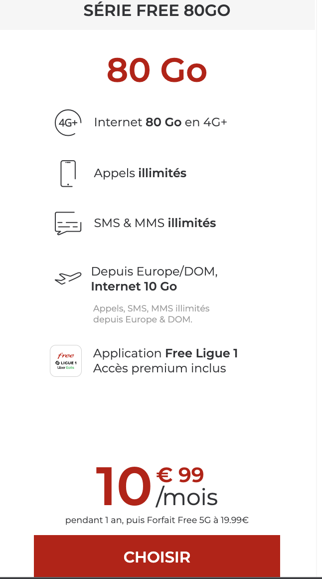 Après être revenu à une formule plus classique le mois dernier à la suite d’une offre spéciale pour ses 10 ans, Free Mobile décide aujourd’hui de maintenir son forfait Série Free 80 Go en France métropolitaine à 10,99€/mois pendant 1 an en y ajoutant de 2 go supplémentaires de données à consommer en roaming, l’enveloppe grimpant ainsi à 10 Go. Au-delà de la première année, les abonnés basculeront automatiquement sur forfait Free 5G 150 Go à 19.99€/mois. Le service Free Ligue 1 Uber Eats est inclus. L’offre est disponible jusqu’au 15 février prochain.