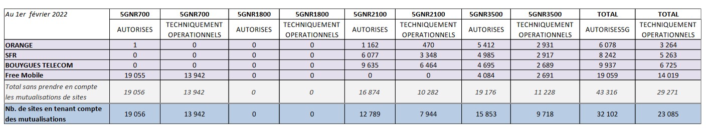 Ci-dessous, le classement des opérateurs au 1er février 2022, par nombre de sites 5G, toutes bandes de fréquences confondues (700 MHz, 2,1 GHz et 3,5 GHz) :