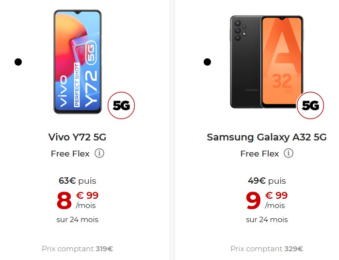 Avec le choc des smartphones, Univers Freebox vous propose des comparatifs entre les smartphones vendus à tarifs équivalents via la boutique de Free Mobile, au gré des nouvelles disponibilités et des mouvements de prix. Notre but ? Vous aidez à mieux choisir. Nous opposons aujourd’hui les smartphones Vivo Y72 5G et Samsung Galaxy A32 5G, affichés au comptant à 319 et 329 euros respectivement. Ils sont également disponibles à 8,99 et 9,99 euros par mois pendant 24 mois via l’offre de location avec option d’achat Free Flex.