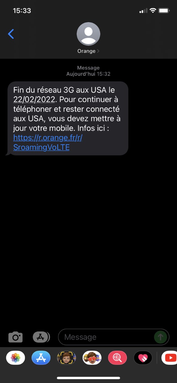 “Fin du réseau 3G aux USA le 22/02/2022. Pour continuer à téléphoner et rester connecté aux USA, vous devez mettre à jour votre mobile”, indique Orange dans un SMS envoyé à ses abonnés et à ceux de sa marque Sosh.