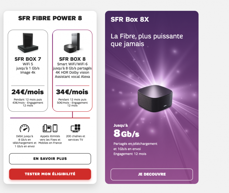 Vient la question du prix de l’abonnement. Pour espérer accéder au 8 Gbits/s chez SFR, les abonnés devront souscrire à l’offre SFR Fibre Power 8 et choisir la SFR Box 8X. Il faudra débourser 34€/mois la première année puis 50€/mois avec un engagement de 12 mois. L’opérateur se place dans la même gamme de prix que la Freebox delta, laquelle propose toutefois plus de services inclus comme Netflix, TV by Canal et Amazon Prime.