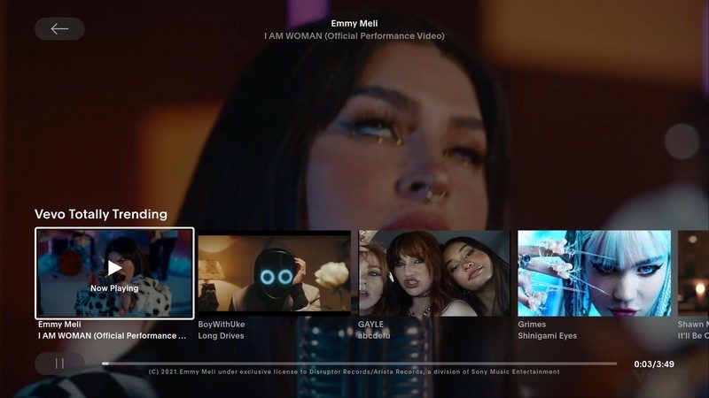 Durant le visionnage de la vidéo, il possible d’afficher le nom et l’interprète, de mettre en pause et d’avoir une idée de la progression dans le contenu. Des vignettes permettent également d’accéder à des contenus recommandés.