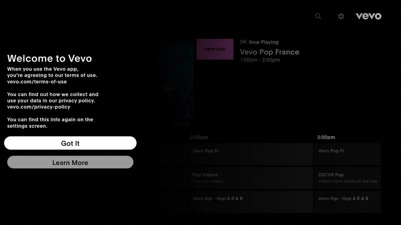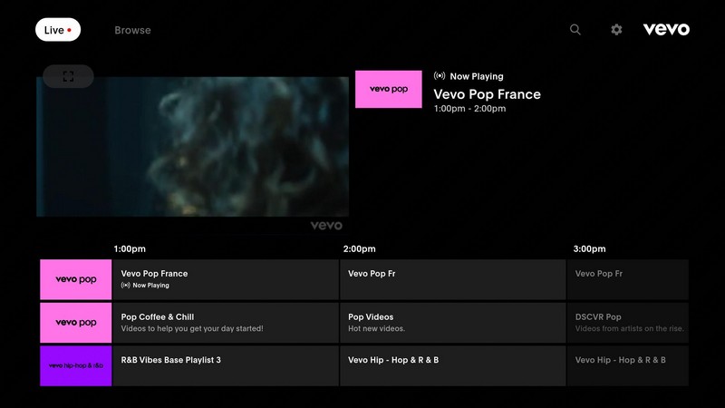 Dans le premier cas, il s’agit de canaux diffusés en direct : Vevo Pop France, Vevo Pop et Vevo hip-hop & r&b.