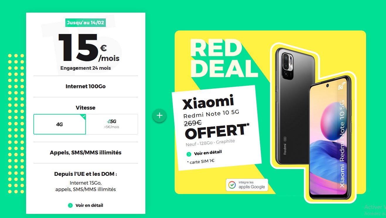 Red by SFR lance un nouveau Deal. Jusqu’au 14 février 2022, la marque low cost de l’opérateur au carré rouge commercialise un forfait avec appels, SMS et MMS illimités, ainsi que 100 Go de data depuis la France métropolitaine et 15 Go en roaming depuis l’Union européenne et les DOM. Il coûte 15 euros dans sa version 4G et 20 euros dans sa version 5G. La carte SIM coûte 1 euro.