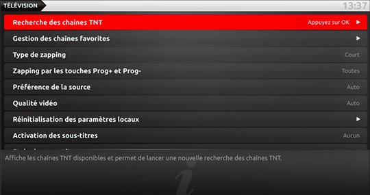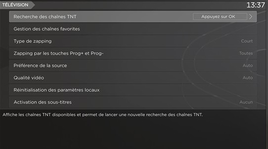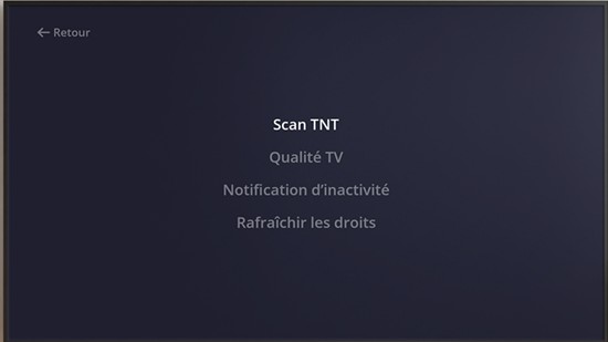 Sur Freebox Révolution, il faut aller dans “Réglages”, puis “Télévision”. De là, il ne reste qu’à lancer le scan avec “Recherche des chaînes TNT”.