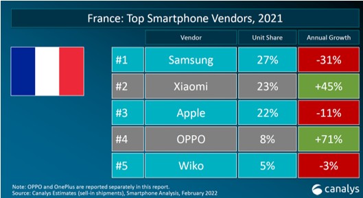 Le cabinet d’analyse Canalys vient de publier le Top 5 des plus grosses marques de smartphones sur le marché français au cours de l’année 2021. Si Samsung reste leader et s’empare de la première place avec 27 % de parts de marché, il accuse également une baisse de 31 % par rapport à 2020.