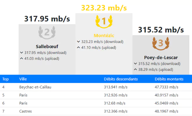 Pour rappel, Univers Freebox vous propose la rubrique “records”. Celle-ci vous permet de découvrir les meilleurs débits réalisés par les utilisateus de l’application RNC Mobile, sur toute la France. Vous pouvez également retrouver les records dans chaque département ou région. A chaque fois, il vous est indiqué le débit descendants et montants de ces records, ainsi que bien sûr les villes dans lesquelles ils ont été mesurés