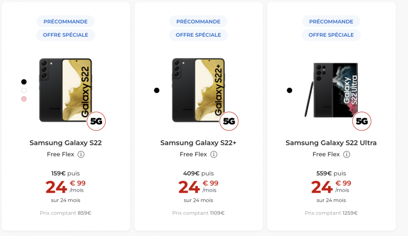 Dans le détail, le Galaxy S22 est affiché en version 128 Go à 859€ en achat comptant, ou à 159€ puis 24 € 99 /mois sur 24 mois via la solution de paiement Free Flex. De son côté, le Galaxy S22+ est proposé à 1109 €, ou à 409€ puis 24 €99/mois sur 24 mois. Enfin, pour acquérir Galaxy S22 Ultra, il faudra débourser 1259€ en achat comptant ou 559€ puis 24 € 99/mois sur 24 mois via Free Flex.