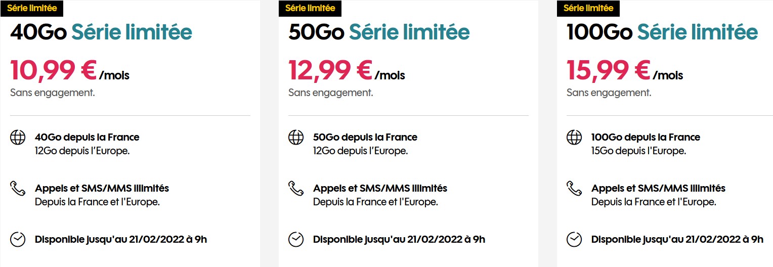 Jusqu’au 21 février 2022, Sosh commercialise des séries limitées 40, 50 et 100 Go à 10,99, 12,99 et 15,99 euros par mois respectivement. Sans engagement de durée, ces forfaits 4G comprennent les appels, SMS et MMS illimités depuis la France métropolitaine et l’Europe, entre 40 et 100 Go depuis la France métropolitaine (débits réduits au-delà) et entre 12 et 15 Go depuis l’Europe.