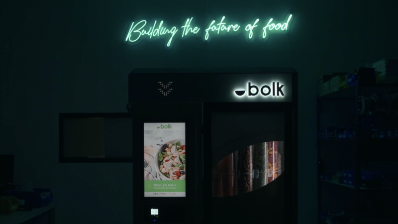 “Manger extra bon extra frais pour le prix d’un ticket resto. Sans bouger du bureau”, la start-up française Bolk se revendique comme la 1ère cantine robotisée. Son principe est de proposer une nouvelle manière de consommer dans les entreprises basées en Ile-de-France des bornes équipées équipées d’un robot qui à travers 24 tubes composés de 24 produits frais, permettent de composer ses propres plats chauds ou froids et les récupérer en 45 secondes chrono. Ces espaces de 2m2 peuvent gérer jusqu’à 100 couverts/jour avec environ 350 combinaisons différentes. Pas de travaux, il suffit d’une prise et du Wifi, le tout clé en main.